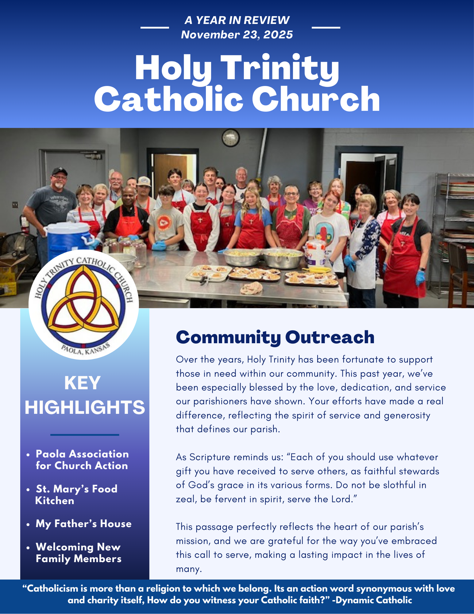 Nestled in the heart of our community, Holy Trinity Catholic Church is a place where faith, fellowship, and service come together. Whether you are new to the area, returning to your faith, or looking for a spiritual home, we welcome you with open arms.
